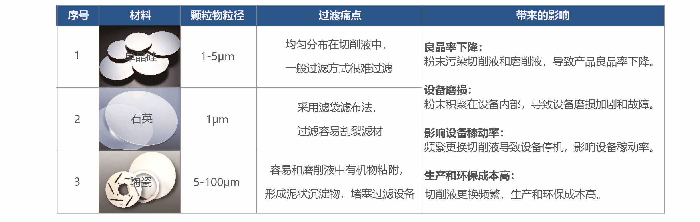 在半導體行業硅片、石英、陶瓷的切削和磨削加工中,切削液常混入大量微小且堅硬的粉末顆粒。這些粉末不僅易堵塞過濾設備,導致頻繁維護和更換,增加生產成本,影響設備稼動率,還對設備造成磨損和腐蝕,縮短使用壽命。傳統過濾方法難以有效分離這些細小顆粒,導致切削液更換頻繁,生產和環保成本高。同時,切削液中的雜油和菌落也一直困擾著制造企業。