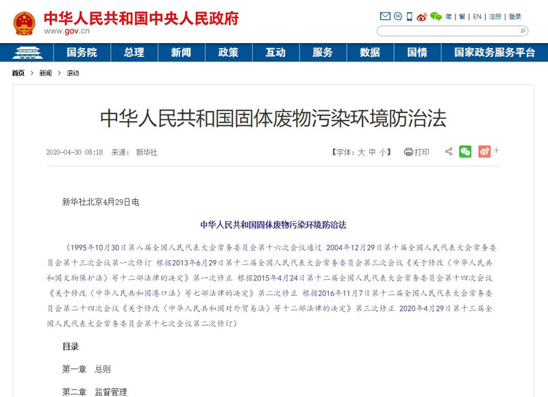 【政策速遞】《中華人民共和國固體廢物污染環境防治法》出臺 2020-05-08 4月29日,新版《中華人民共和國固體廢物污染環境防治法》由全國人大常委會修訂通過,將于自2020年9月1日起施行。 查看詳情