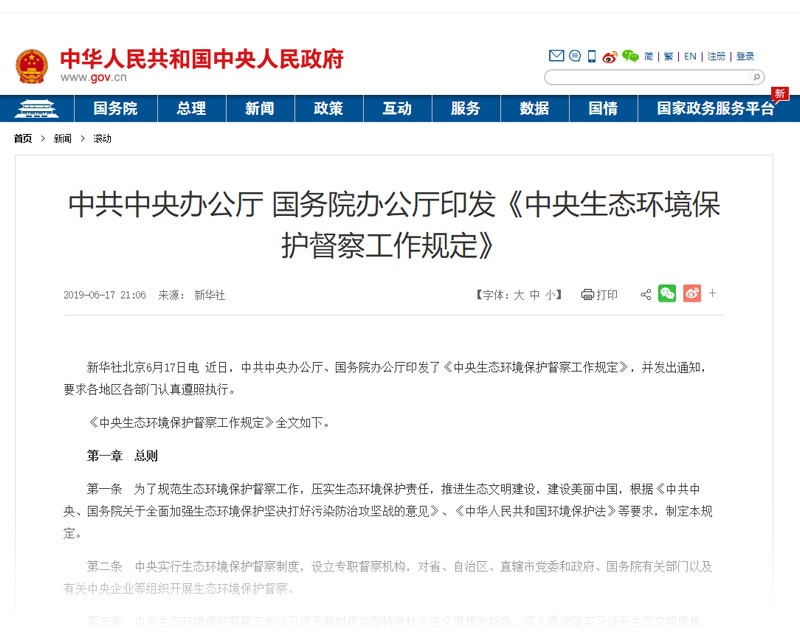 中共中央辦公廳 國務(wù)院辦公廳印發(fā)《中央生態(tài)環(huán)境保護(hù)督察工作規(guī)定》 2019-06-25 新華社北京6月17日電 近日,中共中央辦公廳、國務(wù)院辦公廳印發(fā)了《中央生態(tài)環(huán)境保護(hù)督察工作規(guī)定》,并發(fā)出通知,要求各地區(qū)各部門認(rèn)真遵照執(zhí)行。 查看詳情