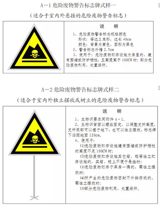 (5)所產(chǎn)生的危險(xiǎn)廢物密封存放的,可將危險(xiǎn)廢物警告標(biāo)志(附件A-1)懸掛于該貯存設(shè)施適當(dāng)?shù)奈恢蒙希部稍谠撡A存設(shè)施附近設(shè)立單獨(dú)的危險(xiǎn)廢物警告標(biāo)志(附件A-2)。