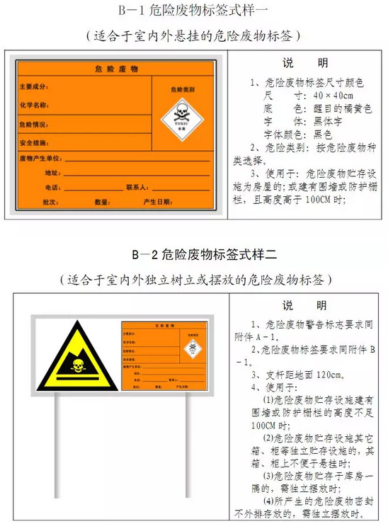 盛裝危險(xiǎn)廢物容器上必須粘貼危險(xiǎn)廢物標(biāo)簽(附件B-3),當(dāng)采取袋裝危險(xiǎn)廢物或不便于粘貼險(xiǎn)廢物標(biāo)簽時(shí),則應(yīng)在適當(dāng)?shù)奈恢孟祾煳kU(xiǎn)廢物標(biāo)簽牌(附件B-4)。