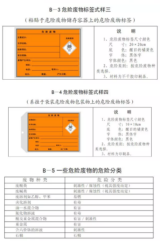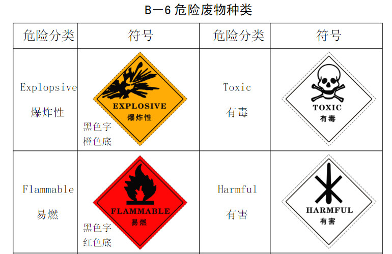 (3)危險(xiǎn)廢物標(biāo)簽的危險(xiǎn)類(lèi)別,應(yīng)根據(jù)所產(chǎn)生的危險(xiǎn)廢物種類(lèi)和性質(zhì),依據(jù)《國(guó)家危險(xiǎn)廢物名錄》,附件B-5《一些危險(xiǎn)廢物的危險(xiǎn)分類(lèi)》和附件B-6《危險(xiǎn)廢物種類(lèi)》確定其危險(xiǎn)類(lèi)別。