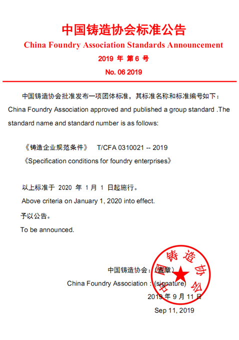 《鑄造企業規范條件》(T/CFA 0310021—2019) 針對行業現狀,瞄準國際先進,規定了鑄造企業的建設條件與布局、企業規模、生產工藝、生產裝備、質量管控、能源消耗、環境保護、安全生產及職業健康和監督管理規范條件。