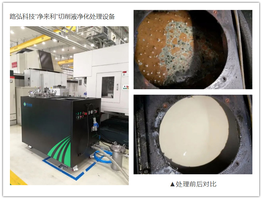 路弘科技基于此技術原理研制的“凈來利”切削液凈化處理設備,除菌后的切削液微生物含量能穩定在10?CFU/mL以下,最低可至10?CFU/mL以內。“凈來利”切削液凈化處理設備在殺滅微生物的同時,還可對切削液中的雜油和顆粒物進行分離和去除,進一步改善抑菌環境,達到長效抑菌除臭。