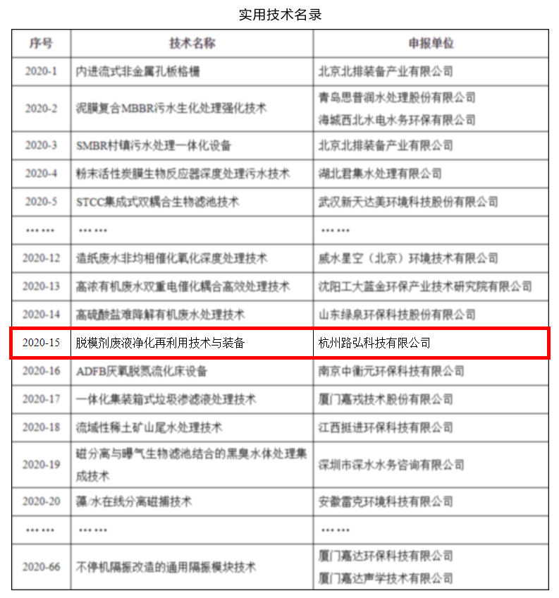 為助力打好污染防治攻堅戰,加快先進適用環境保護技術的推廣應用,促進環保產業技術進步,中國環境保護產業協會組織了2020年重點環境保護實用技術和示范工程的征集和篩選工作。經征集、篩選和公示,近日正式公布了《2020年重點環境保護實用技術和示范工程名錄》,路弘科技“脫模劑廢液凈化再利用技術與裝備”成功入選。