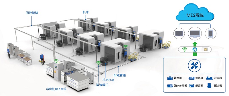 在交流中發(fā)現(xiàn),不少企業(yè)在進(jìn)行智慧工廠建設(shè),需要一套智能化的切削液集中供液系統(tǒng)作為智慧工廠的一部分,還有的企業(yè)為了提高供液效率、節(jié)省人力,也提出了對(duì)現(xiàn)有單機(jī)供液模式進(jìn)行升級(jí),改造成切削液智能凈化供液系統(tǒng)。路弘科技在這方面已掌握了關(guān)鍵性技術(shù),并且有眾多實(shí)際案例,可以為企業(yè)實(shí)現(xiàn)從機(jī)床排液、凈化處理、切削液配比到集中供液的全自動(dòng)化運(yùn)行,并且系統(tǒng)搭載的中央控制系統(tǒng),可以實(shí)時(shí)采集各類傳感數(shù)據(jù),并共享到工廠MES系統(tǒng),與工廠生產(chǎn)管理融為一體。示意圖如下: