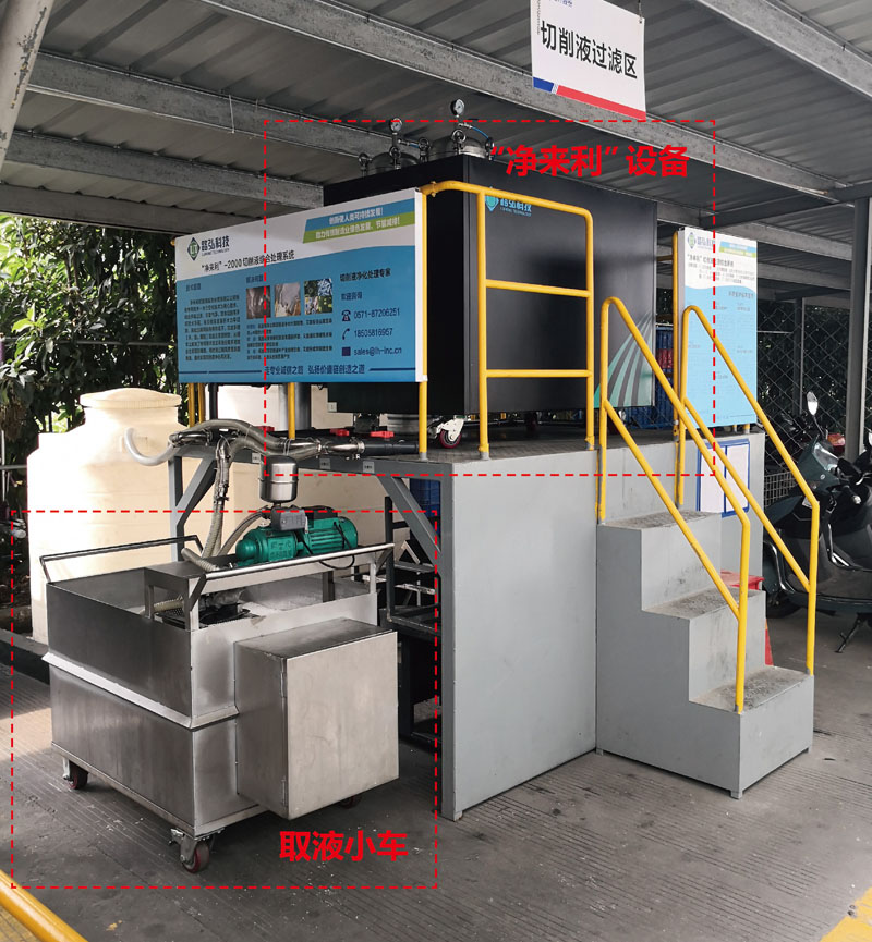 將“凈來利”設(shè)備固定安裝在某一位置;用取液小車將機(jī)床水箱內(nèi)的切削液取出,運(yùn)送至“凈來利”設(shè)備旁;設(shè)備隨后對(duì)小車內(nèi)的切削液進(jìn)行凈化處理;處理完成后,再通過移液小車將凈化后的切削液送回機(jī)床水箱循環(huán)使用。