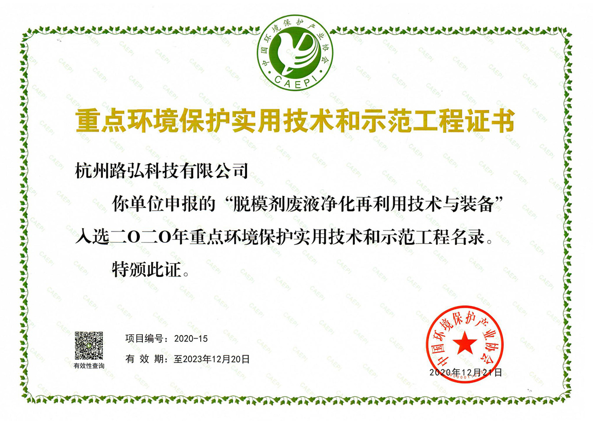 近年來路弘科技的創新成果碩果累累,得到了國內諸多機構的肯定和表彰,獲得了中國環境保護產業協會頒發的《重點環境保護實用技術和示范工程證書》,獲得國家級經濟技術開發區綠色發展聯盟舉辦的首屆“綠創杯”綠色技術創新大賽“綠創之星”榮譽稱號等。