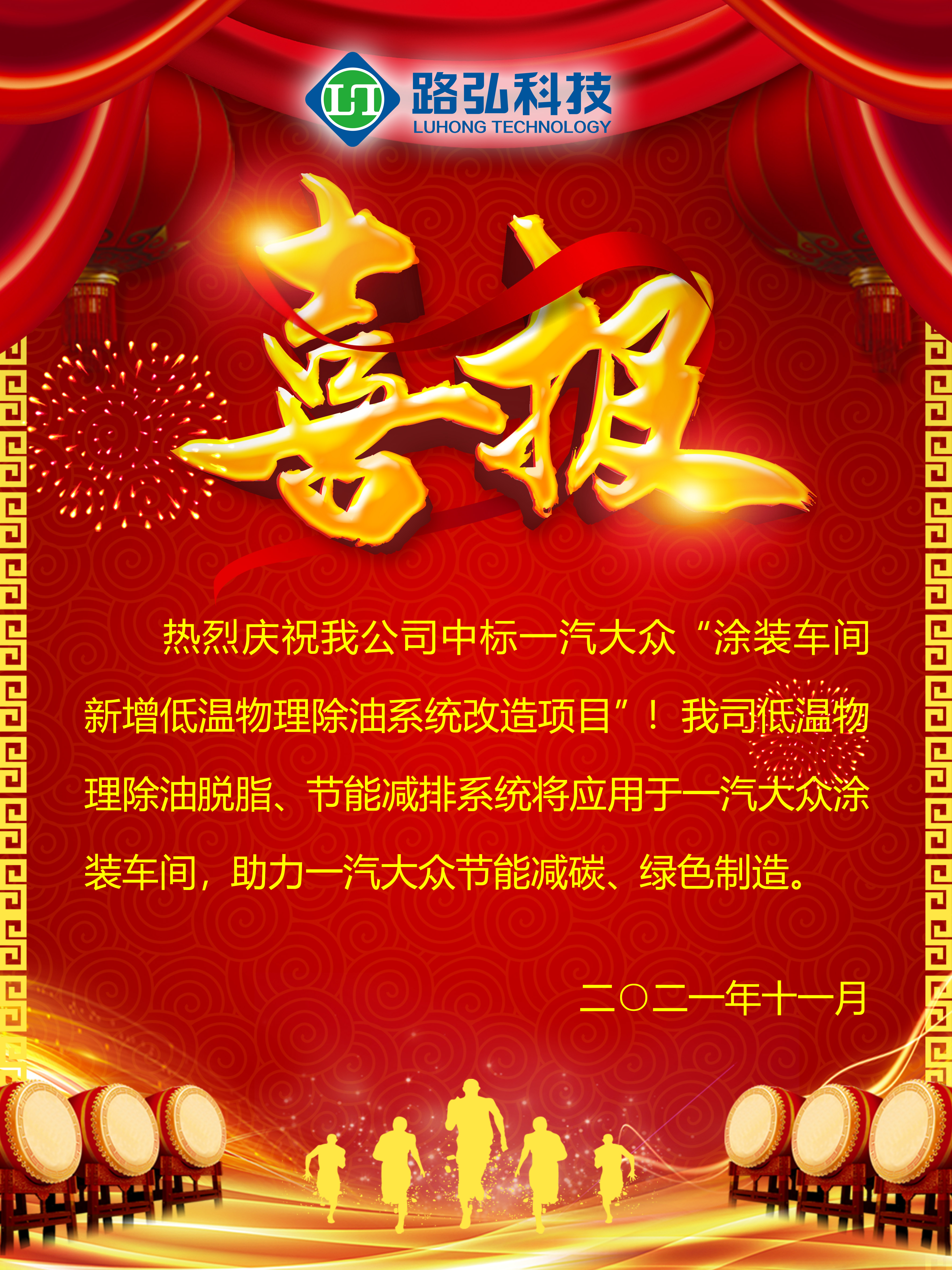一汽大眾作為我國汽車行業標桿企業,積極響應國家“碳達峰、碳中和”的號召,經過嚴格論證,選用路弘科技低溫物理除油脫脂、節能減排系統,用于實現涂裝車間的節能減碳、綠色制造。