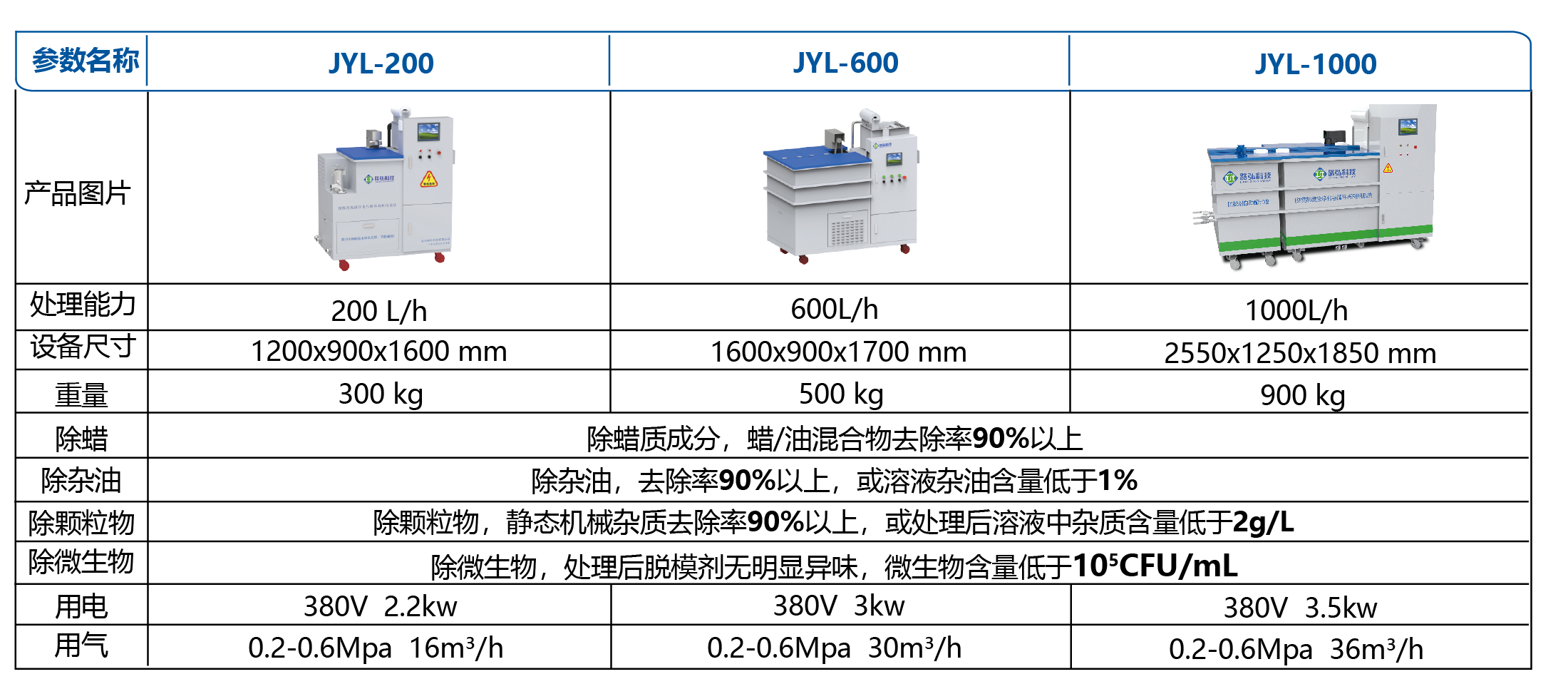 JYL-200最大處理能力在200L/h,相比其他兩款“凈有利”產品,它靈巧輕便的同時,除蠟、除油、除顆粒物、除微生物的效果也很顯著,并彌補了凈有利產品在脫模劑廢液日處理量2噸左右的市場空白!