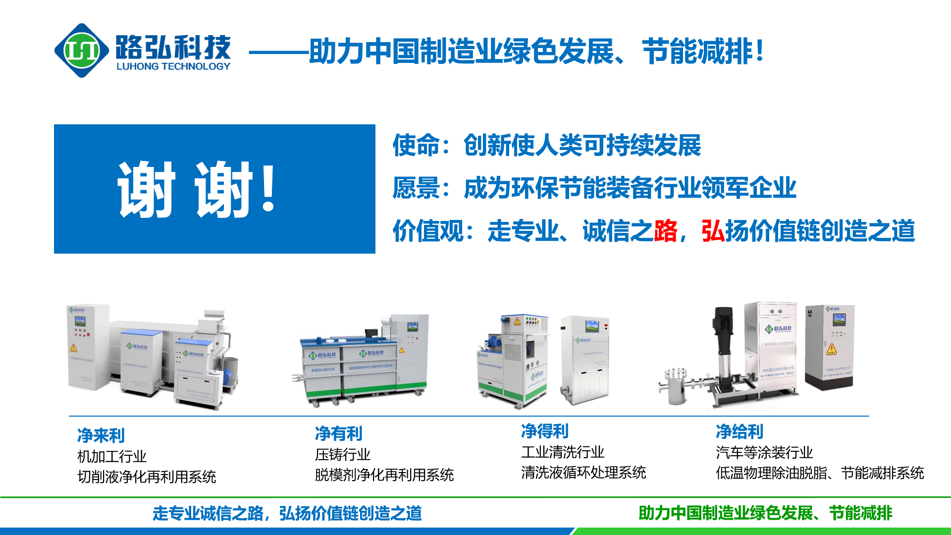 路弘科技在聞路紅博士團隊的帶領下,經過多年潛心研究,已經成為國內水力空化技術產業化應用的領導者,開發了“凈來利”切削液凈化再利用系統、“凈得利”清洗液凈化再利用系統、凈有利”脫模劑廢液凈化再利用系統等系列產品,助力鑄造企業綠色發展,節能減碳!