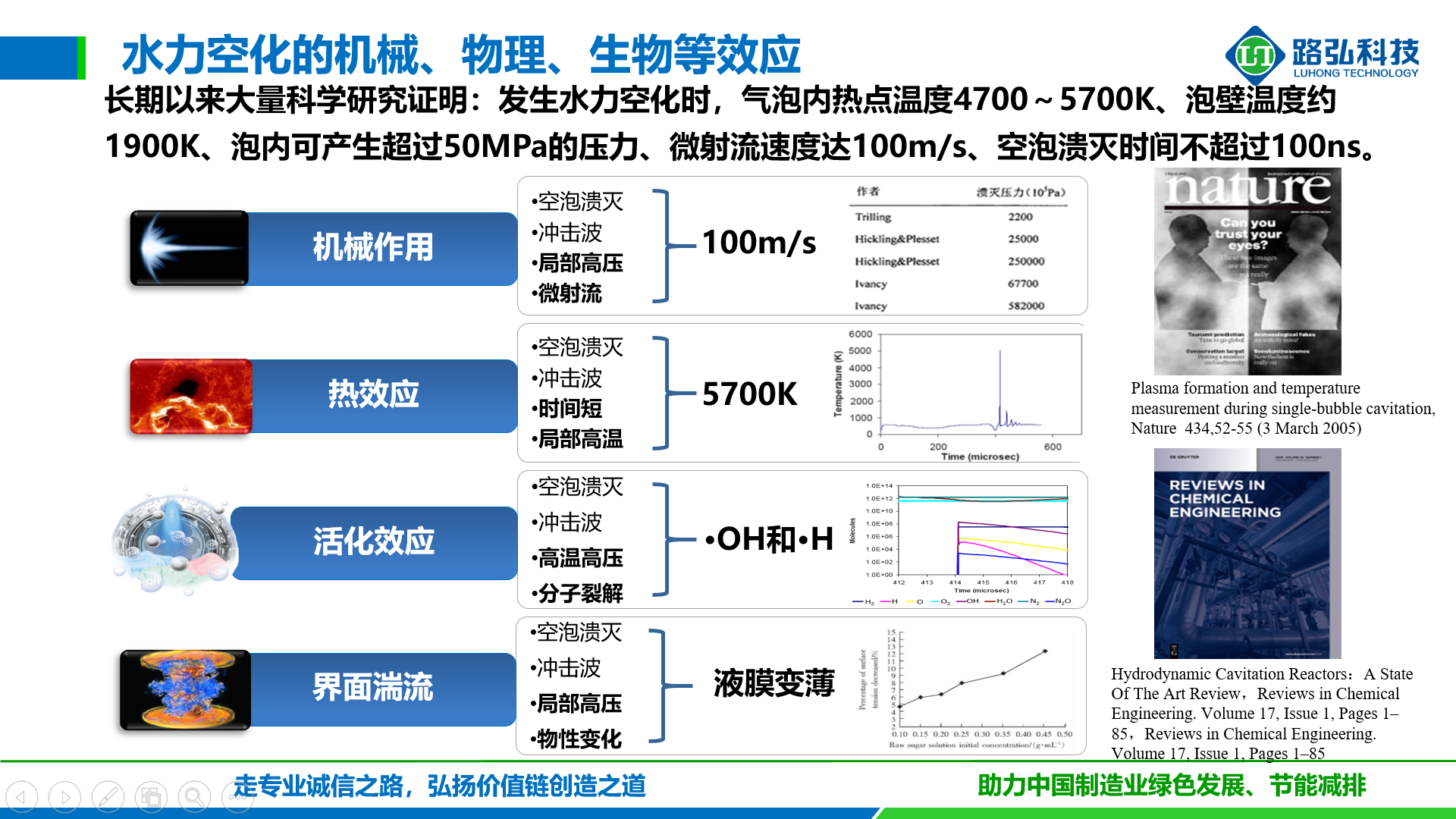 路弘科技獨特的水力空化技術是一種純物理的綠色技術,它能產生沖擊波、微觀態的高溫高壓、以及羥基自由基(OH-)。