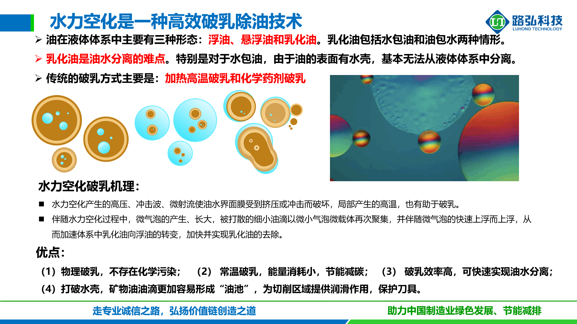 利用水力空化生產的沖擊波能把深層次的水包油的水殼打破,將水包油中的雜油釋放出來,水殼打破后油分子團與油分子團重新結合,由于產生氣泡形成油泡而膨脹上浮,水殼被打破后,顆粒物處于懸浮態,由于油泡表面粘性大,顆粒物會和油泡粘在一起,油泡上浮過程中把懸浮態細微顆粒物也帶出來,到液體表面后容易被去除。此外,水力空化產生的強大沖擊波會對微生物進行細胞破壁、無論對真菌、厭氧菌都是無差別的滅菌,滅菌率達95%以上,此外水力空化會產生羥基自由基(OH-),使切削液處于弱堿性狀態,能抑制含油廢液中微生物生長,所以水力空化技術是高效的物理滅菌手段。因此,水力空化技術不僅能高效的破乳除油、去除細微顆粒物、物理殺菌,且空化效率還是同等功率超聲空化的10-30倍,能耗僅是超聲空化的5%-10%。